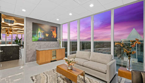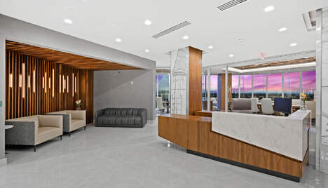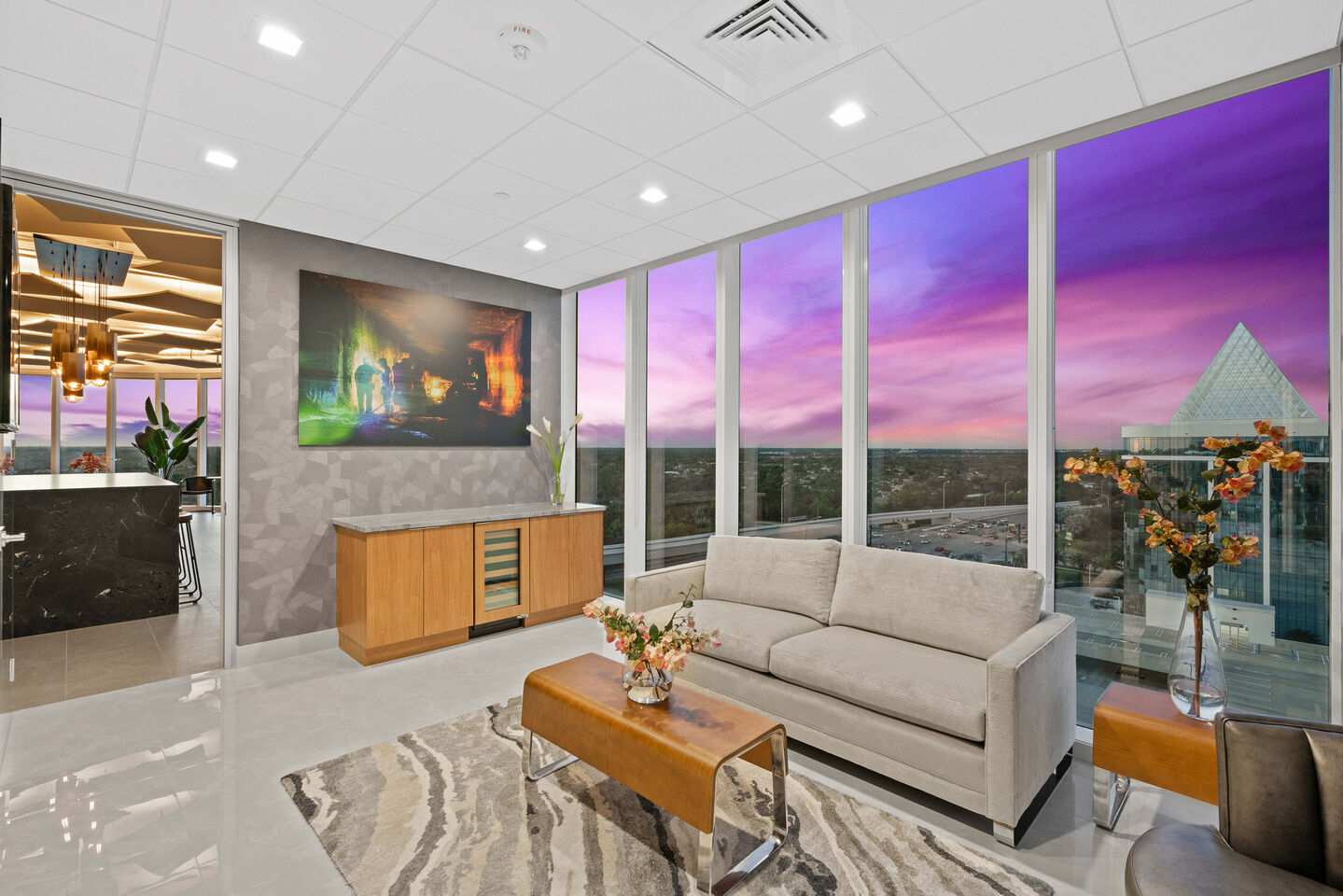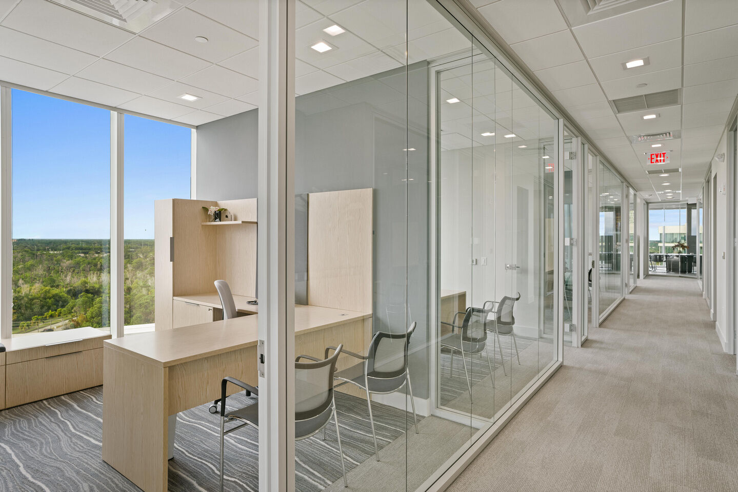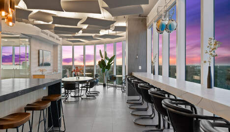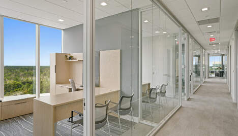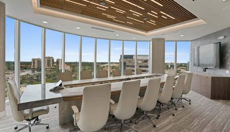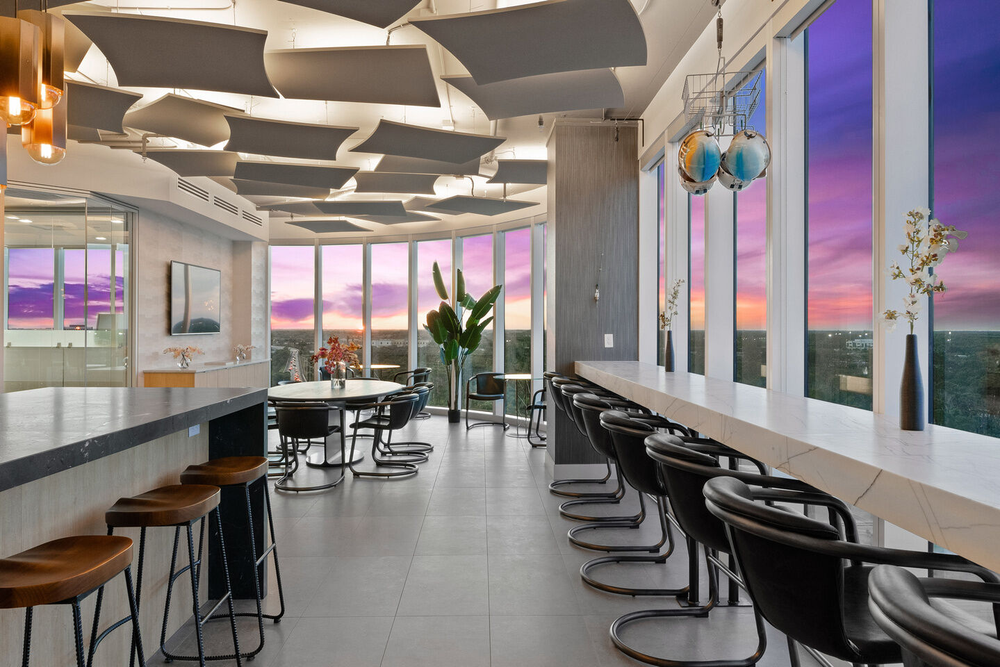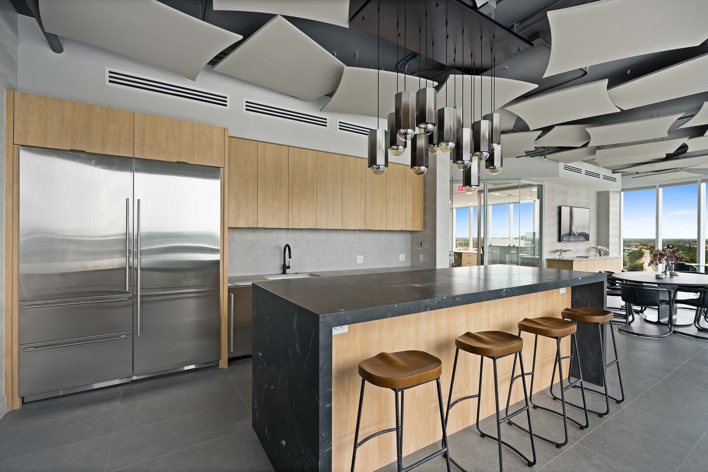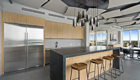Within the Business Lounge, the Negresco Quartzite island is used for employee lunch gatherings. The ceiling is transformed with floating acoustical clouds, hung at multiple heights for illumination, drawing you into a floor to ceiling glass office corridor.