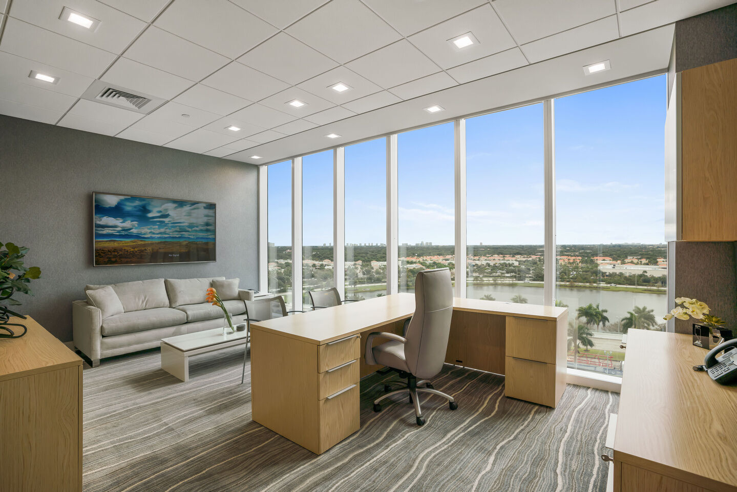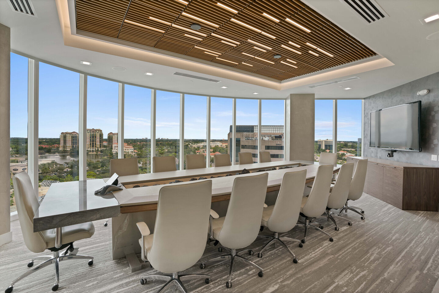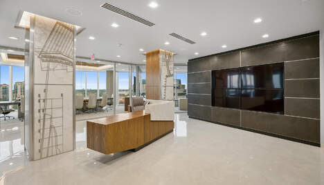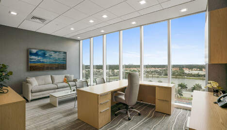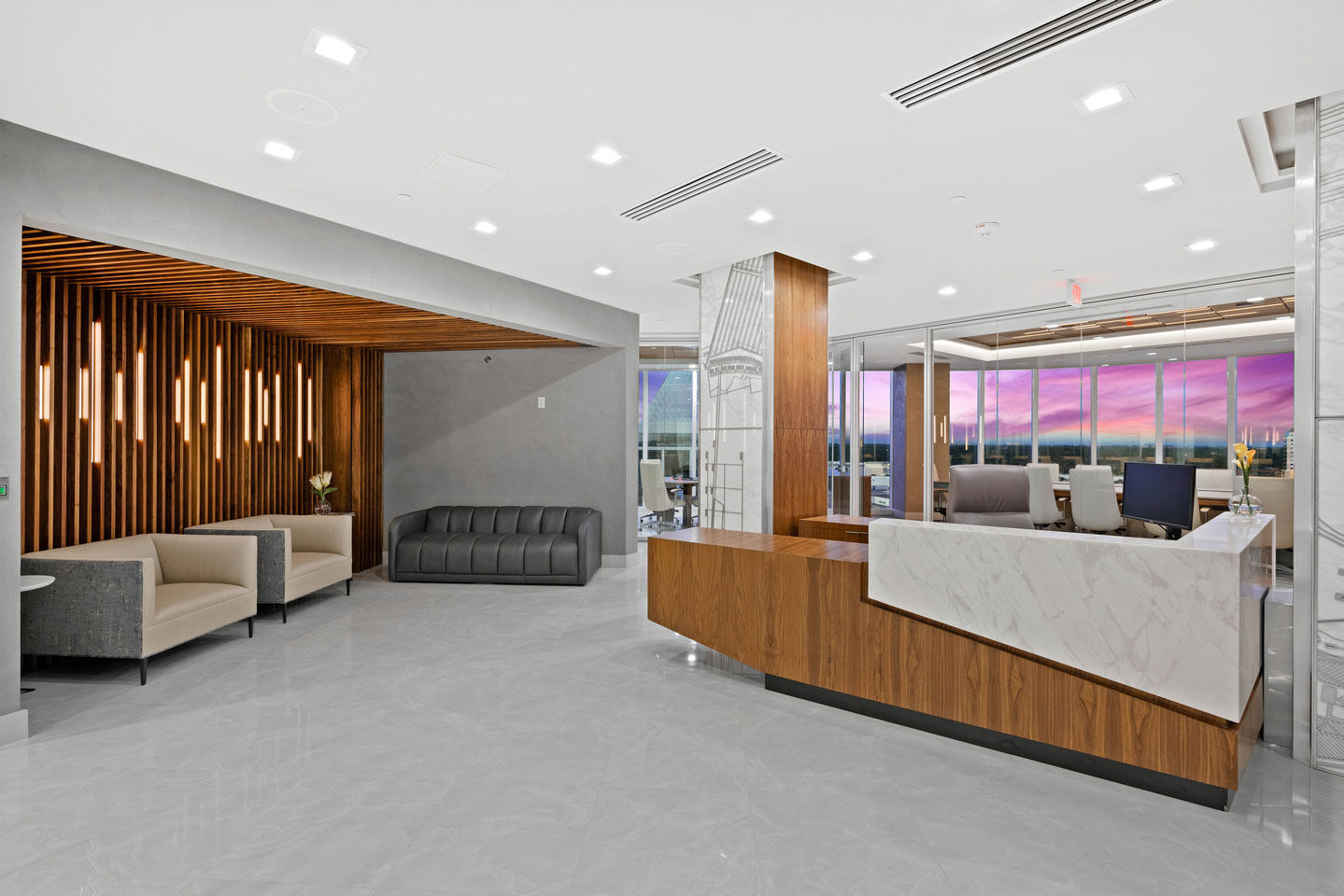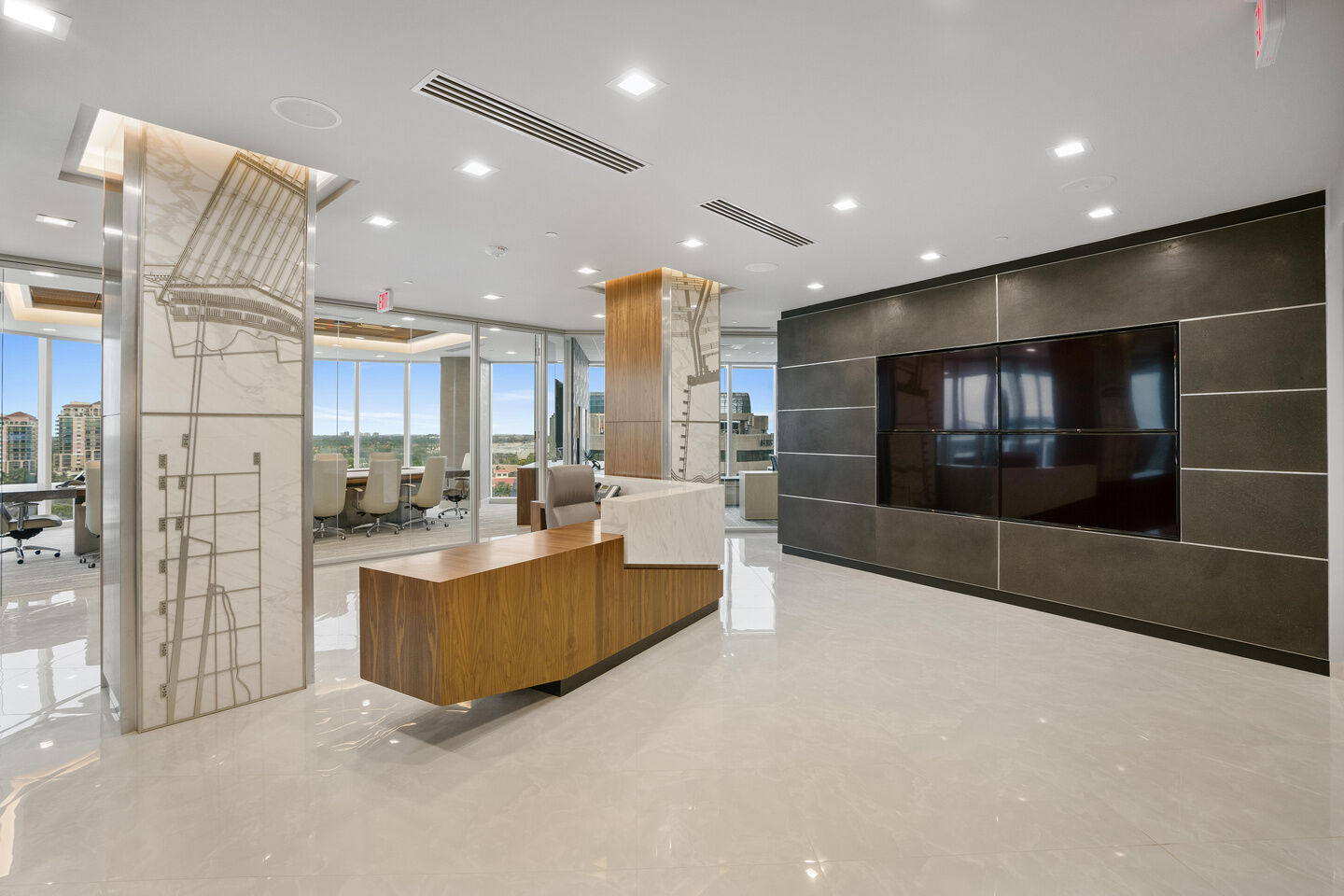 Located in Palm Beach Gardens, FL. You cannot miss the large lit trangles as you exit from Highway 95 onto PGA Boulevard. As you arrive at the stunning towers of Divosta Towers, you embrace a full glass view of Downtown at the Gardens, Palm Beach and the Jupiter Lighthouse. The boardroom is framed by Parasido marble columns that disappear into the ceiling, featuring water jet aluminum artwork that portrays the company's operations. The placement of the sitting area alcove is carefully carved into the lobby's angled walls to avoid any disruption to the views.