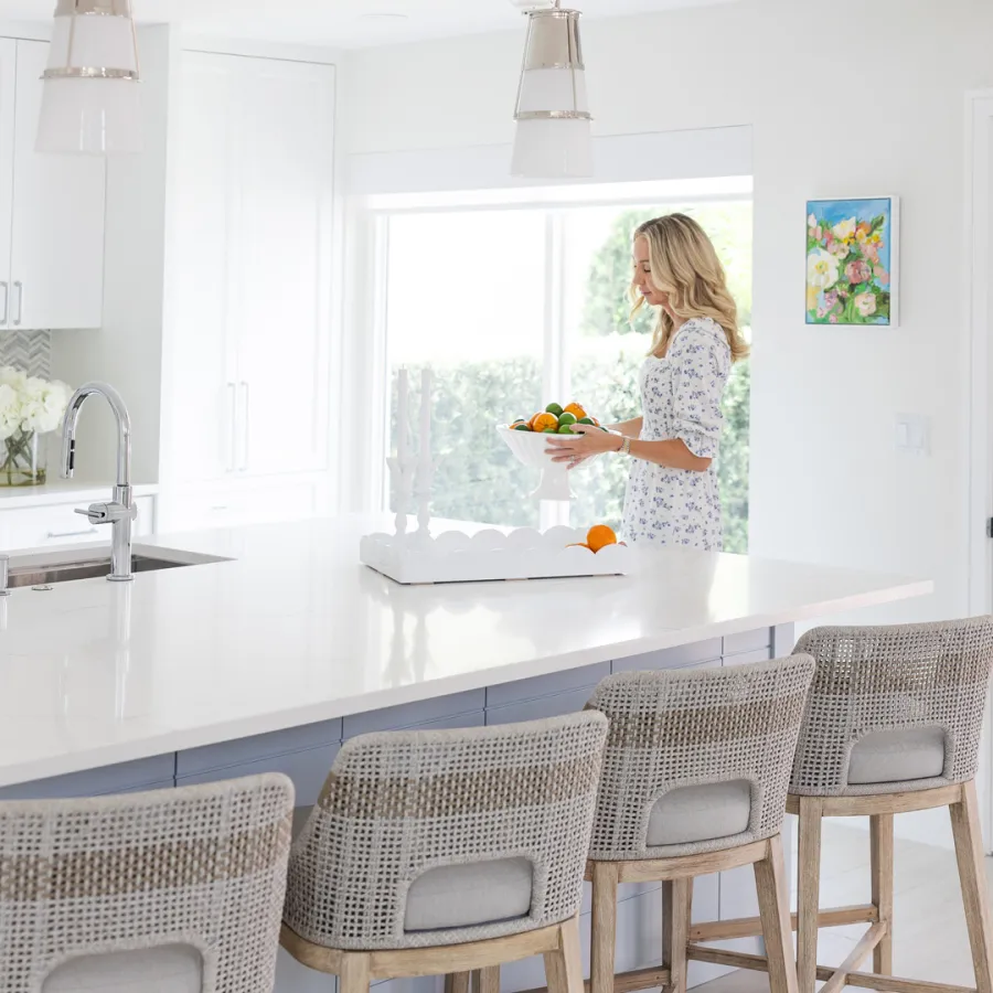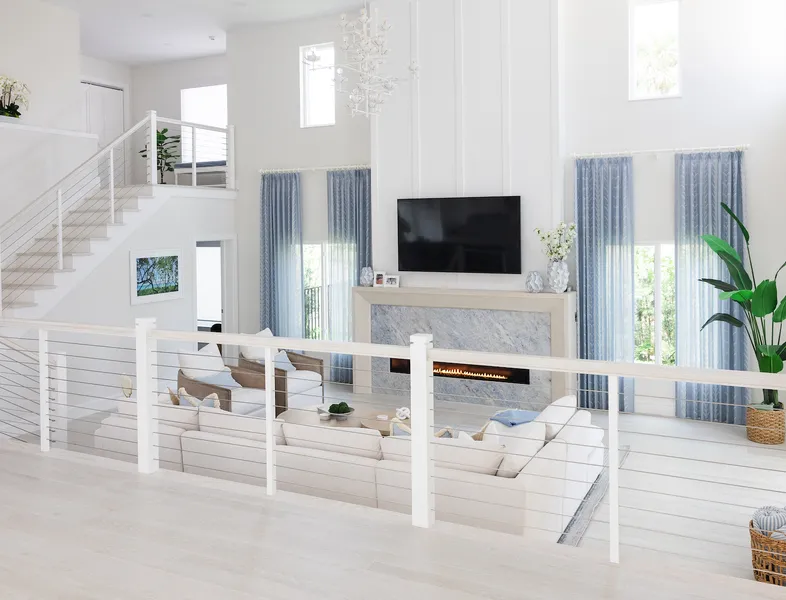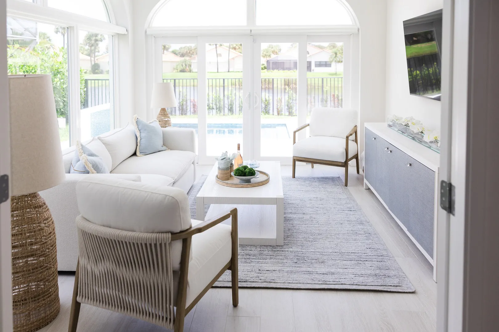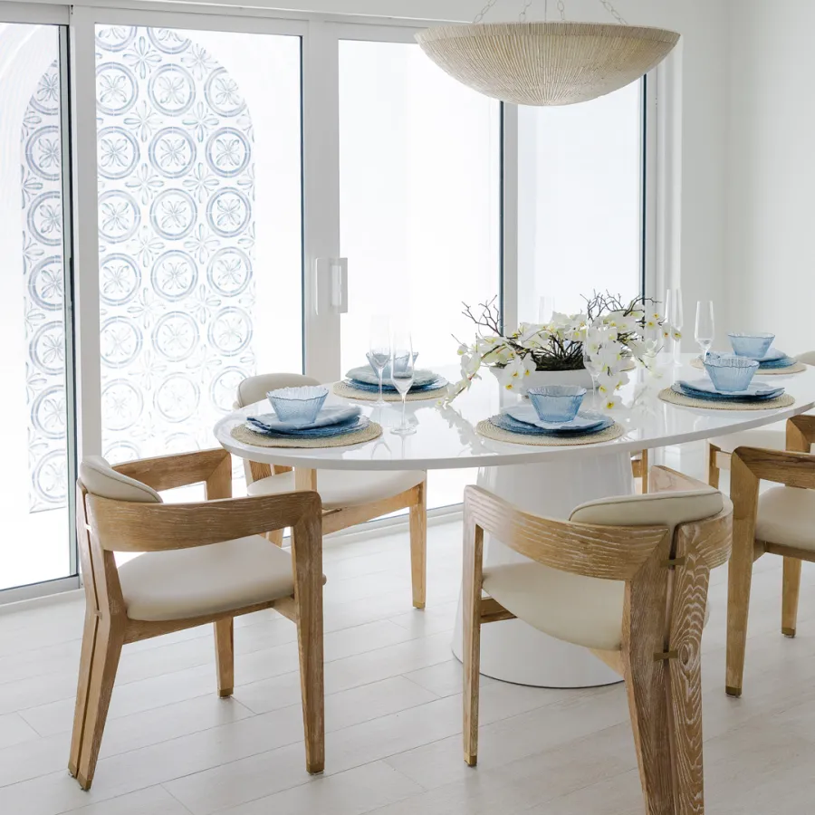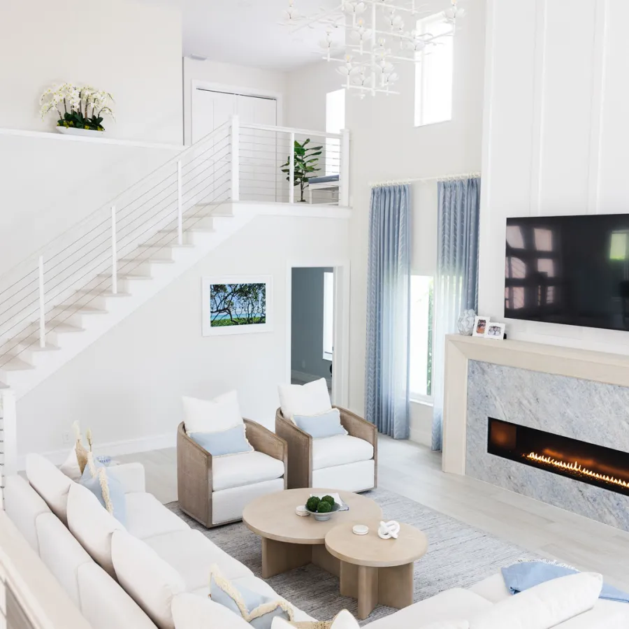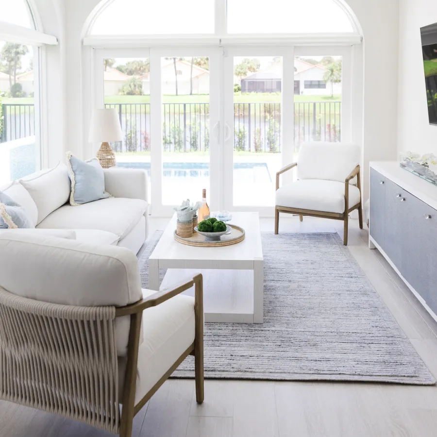 Situated in the exquisite setting of Jonathan's Landing, this 3,275-square-foot golf-front residence has been expertly renovated by Rothrock Construction. Offering three elegant bedrooms and four luxurious baths, the home features stunning interior designs by Rothrock Interiors. The living space is flooded with natural light and showcases high ceilings and a white plaster floral chandelier, enhancing the airy ambiance. The soft coastal style of the home creates a distinct presence in the Palm Beach area. The cool blues and white tones, combined with natural textures, reflect theĀ elements of Juno Beach in this golf community residence.