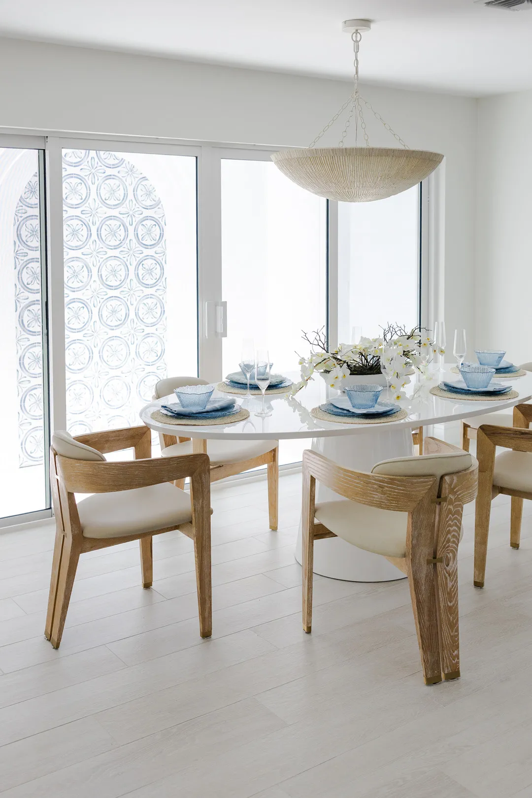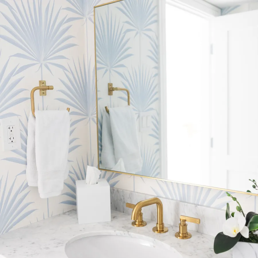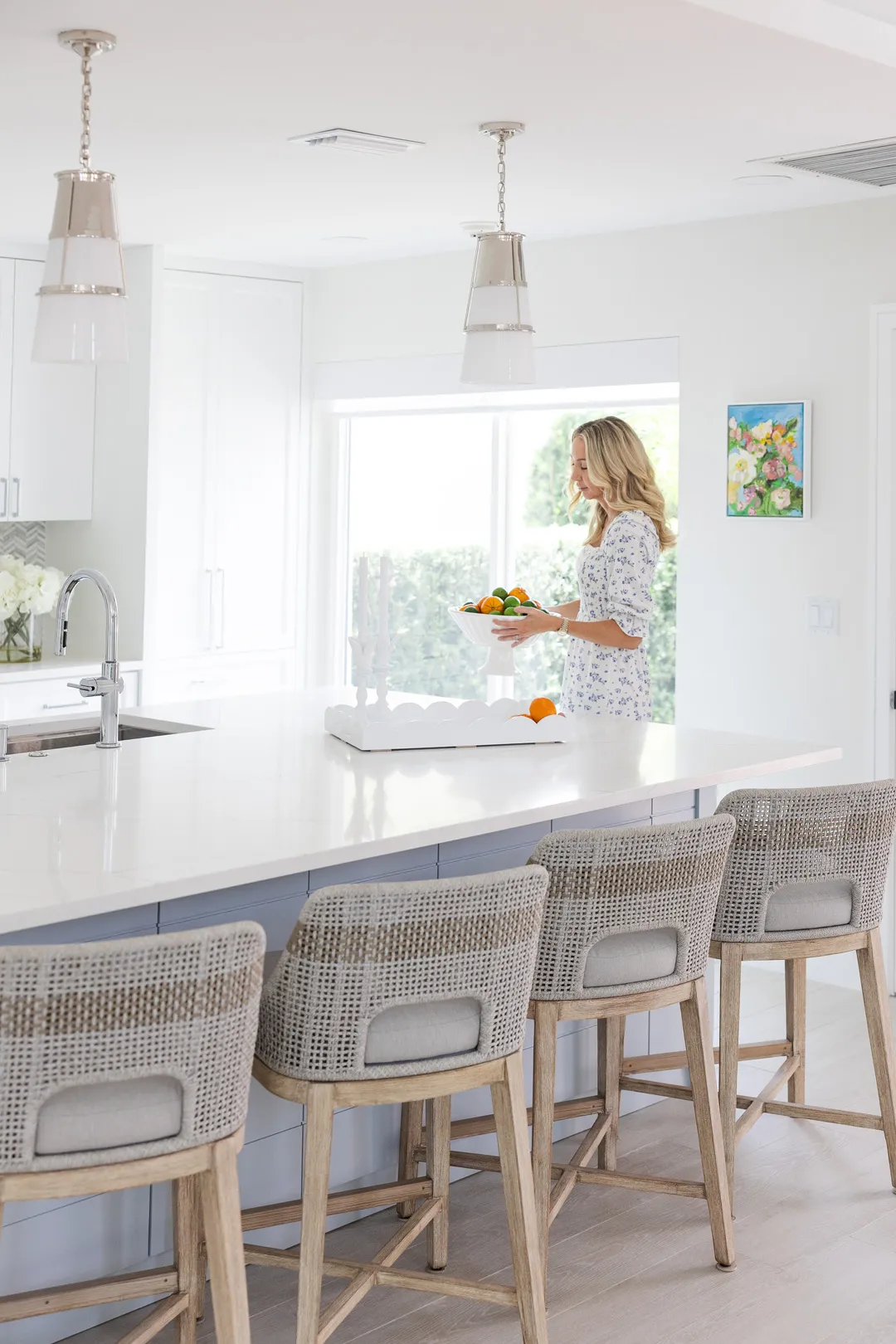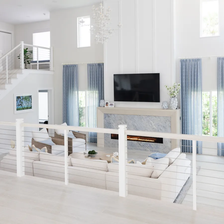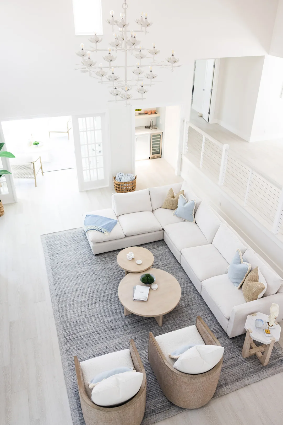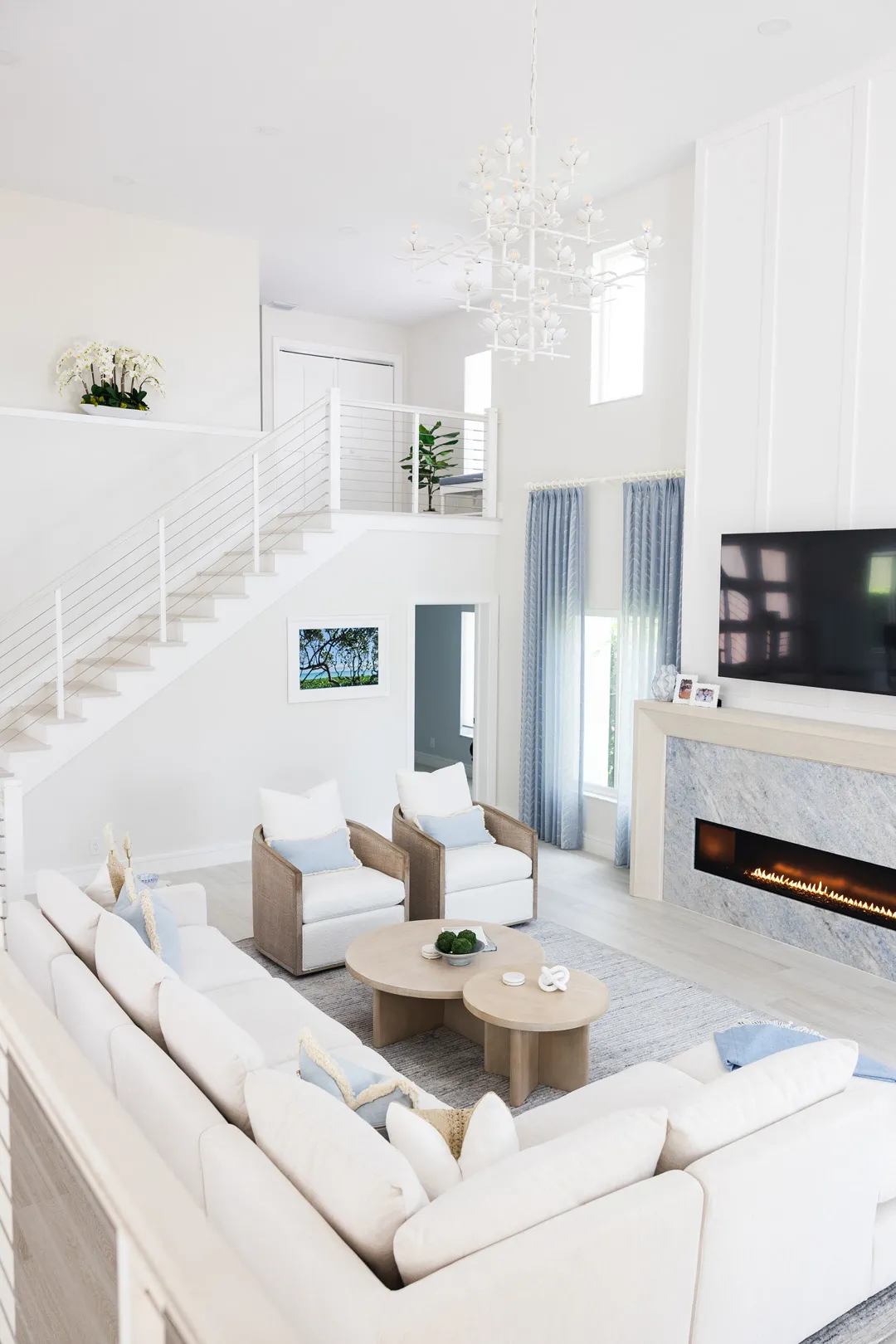Situated in the exquisite setting of Jonathan's Landing, this 3,275-square-foot golf-front residence has been expertly renovated by Rothrock Construction. Offering three elegant bedrooms and four luxurious baths, the home features stunning interior designs by Rothrock Interiors. The living space is flooded with natural light and showcases high ceilings and a white plaster floral chandelier, enhancing the airy ambiance. The soft coastal style of the home creates a distinct presence in the Palm Beach area. The cool blues and white tones, combined with natural textures, reflect theĀ elements of Juno Beach in this golf community residence.