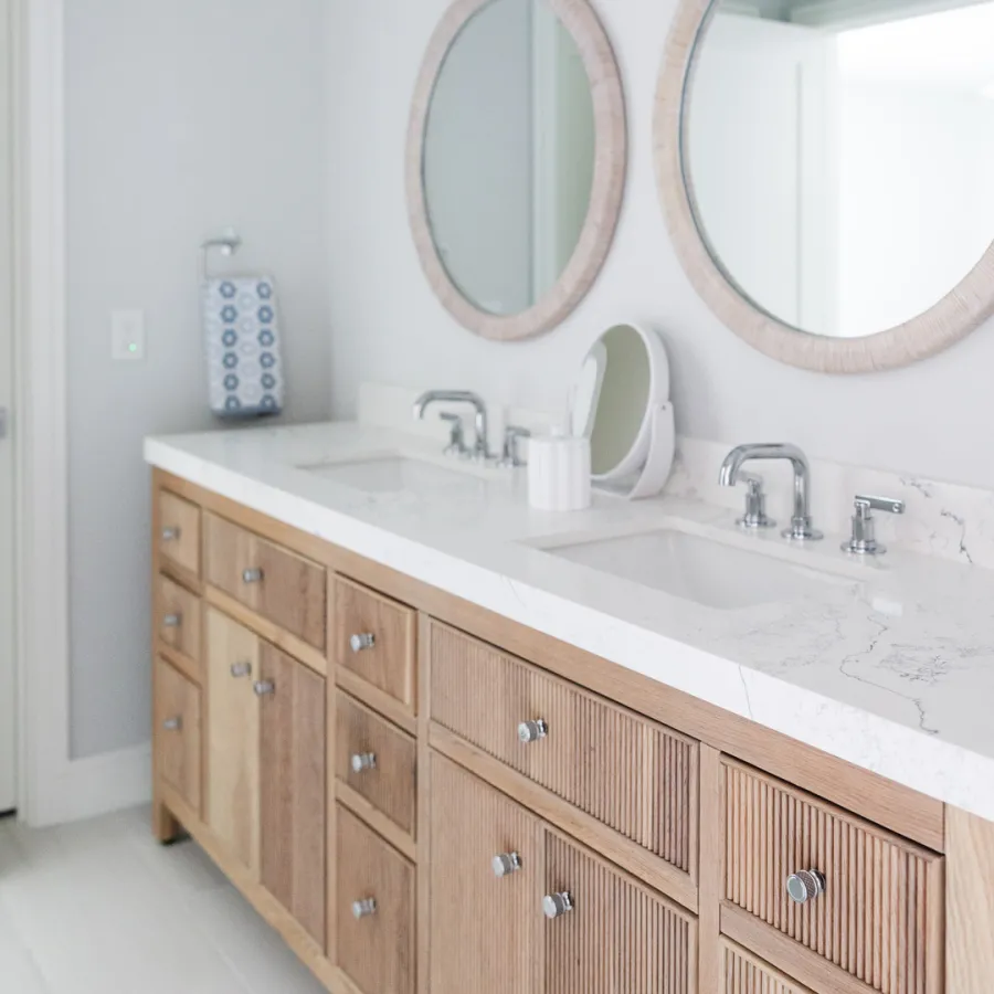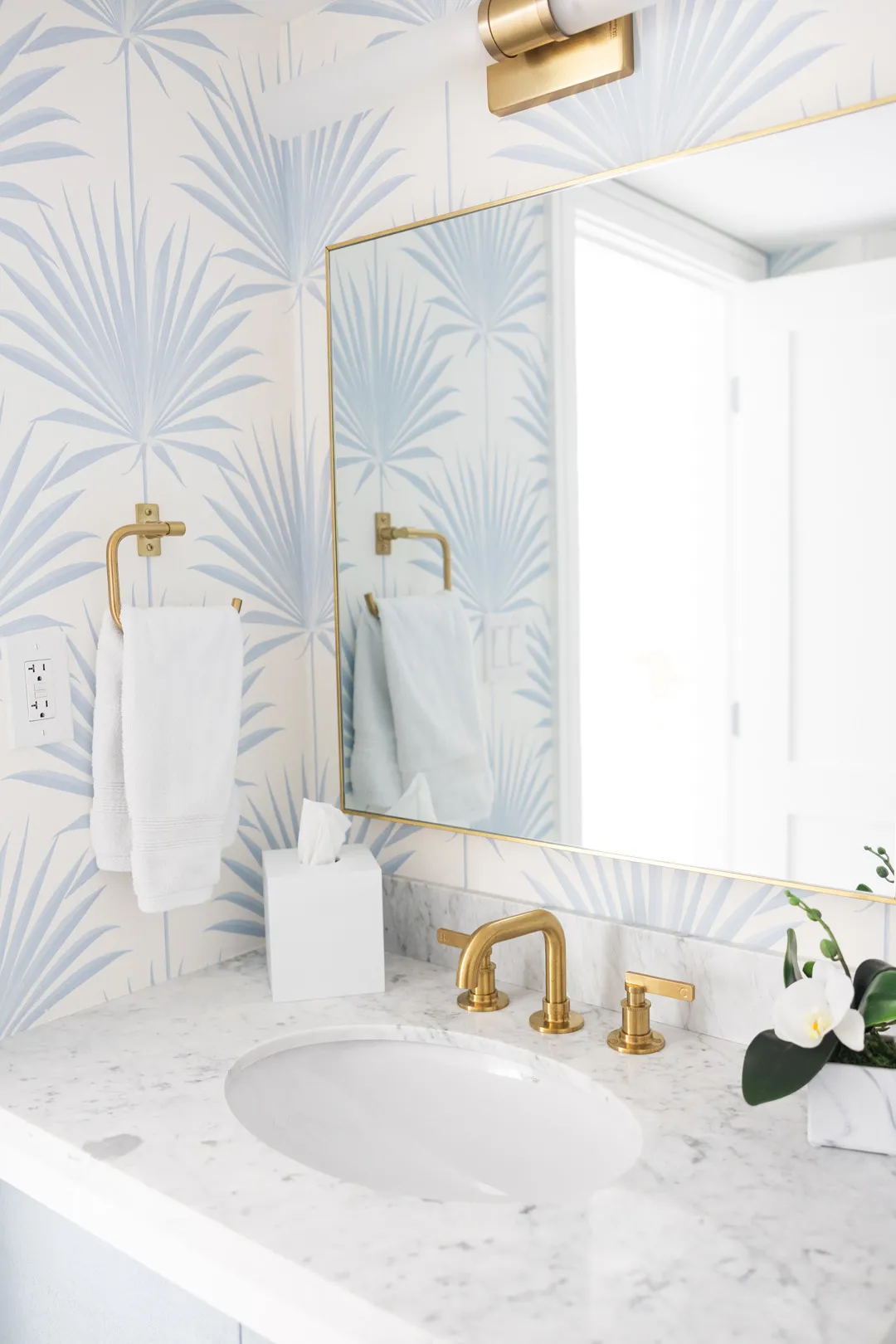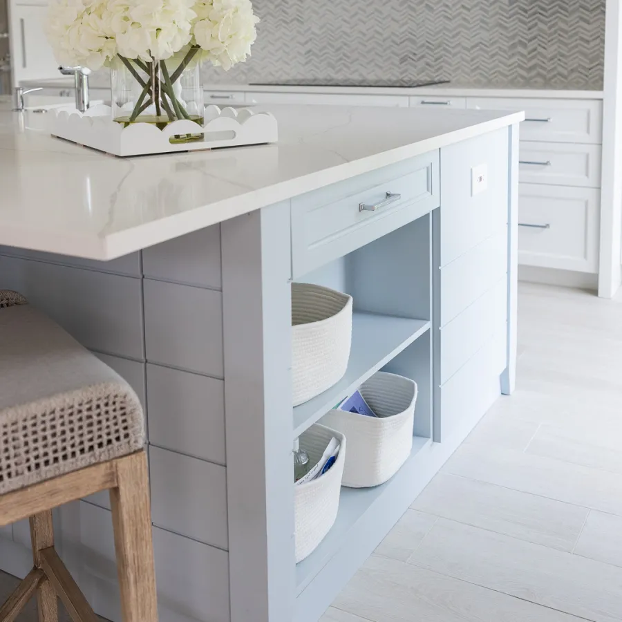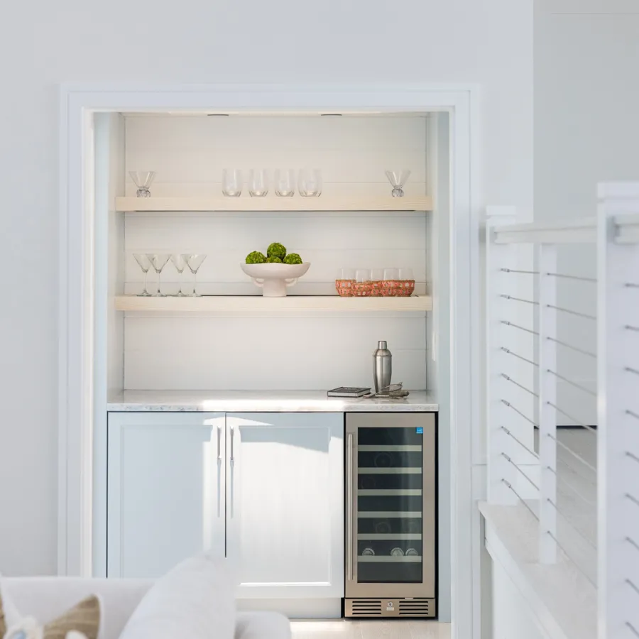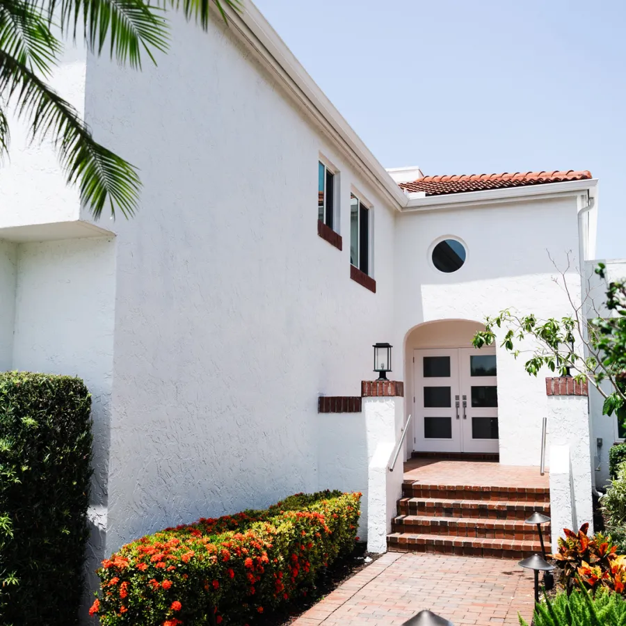 Situated in the exquisite setting of Jonathan's Landing, this 3,275-square-foot golf-front residence has been expertly renovated by Rothrock Construction. Offering three elegant bedrooms and four luxurious baths, the home features stunning interior designs by Rothrock Interiors. The living space is flooded with natural light and showcases high ceilings and a white plaster floral chandelier, enhancing the airy ambiance. The soft coastal style of the home creates a distinct presence in the Palm Beach area. The cool blues and white tones, combined with natural textures, reflect theĀ elements of Juno Beach in this golf community residence.