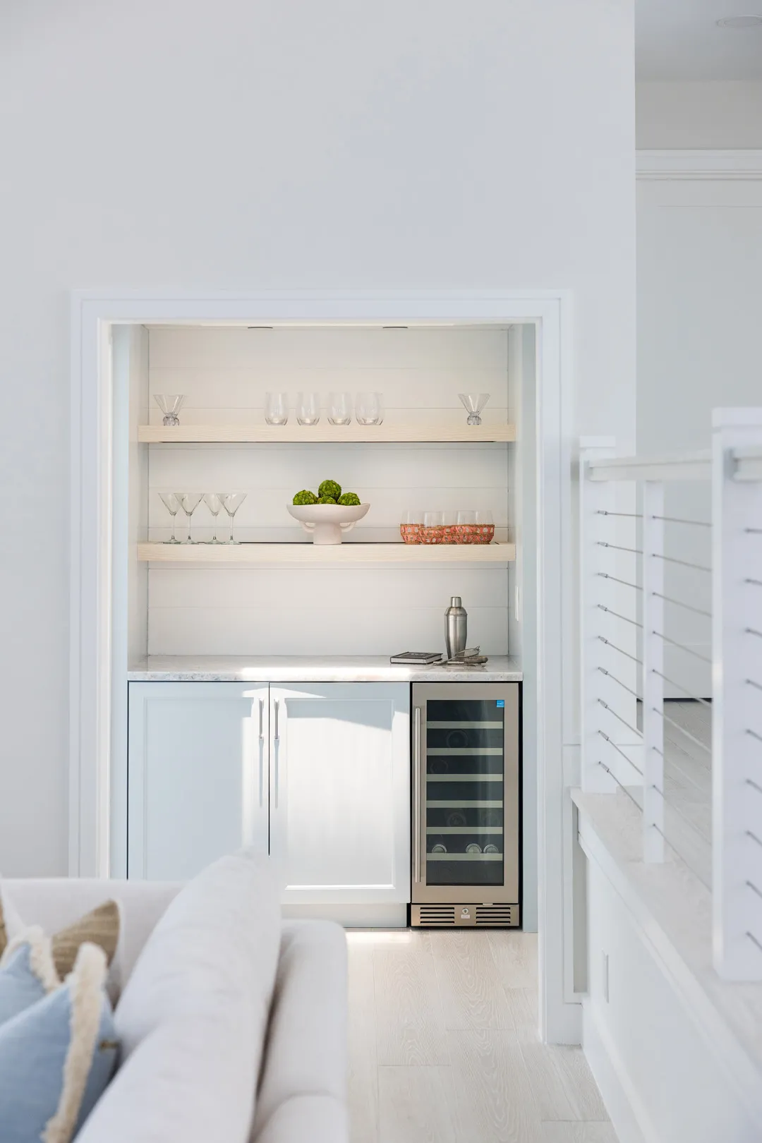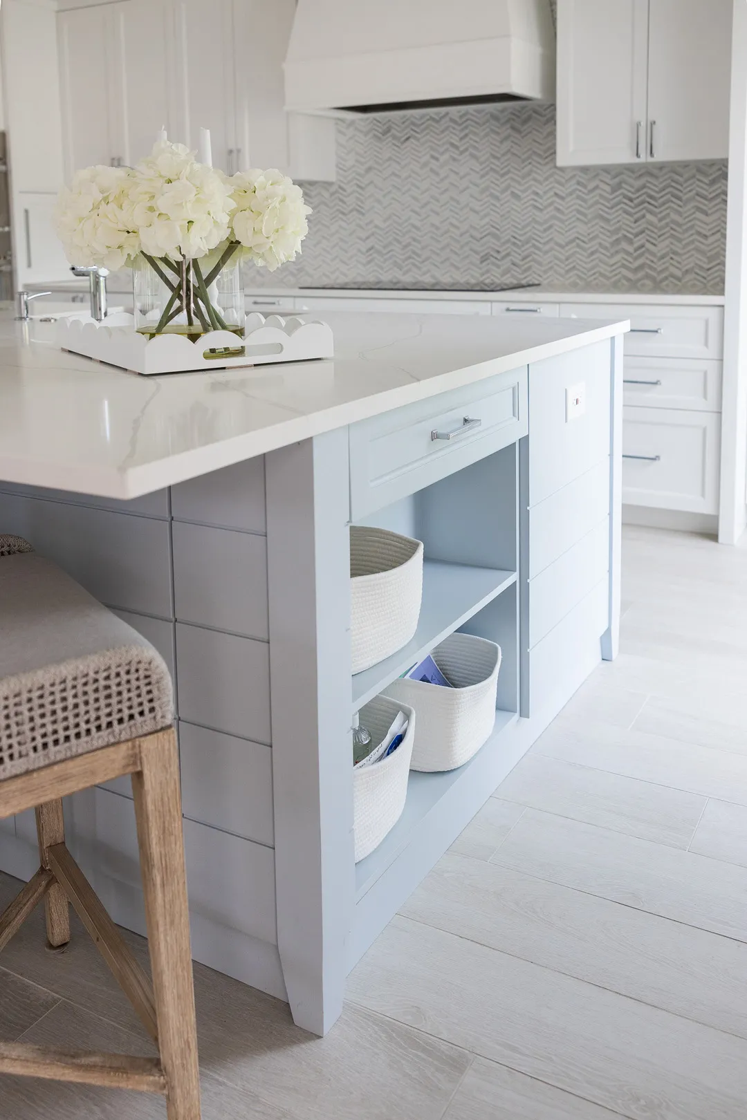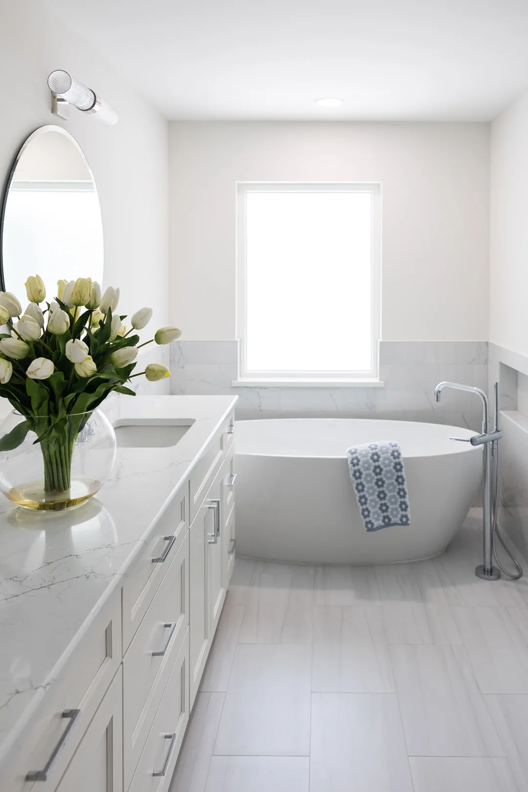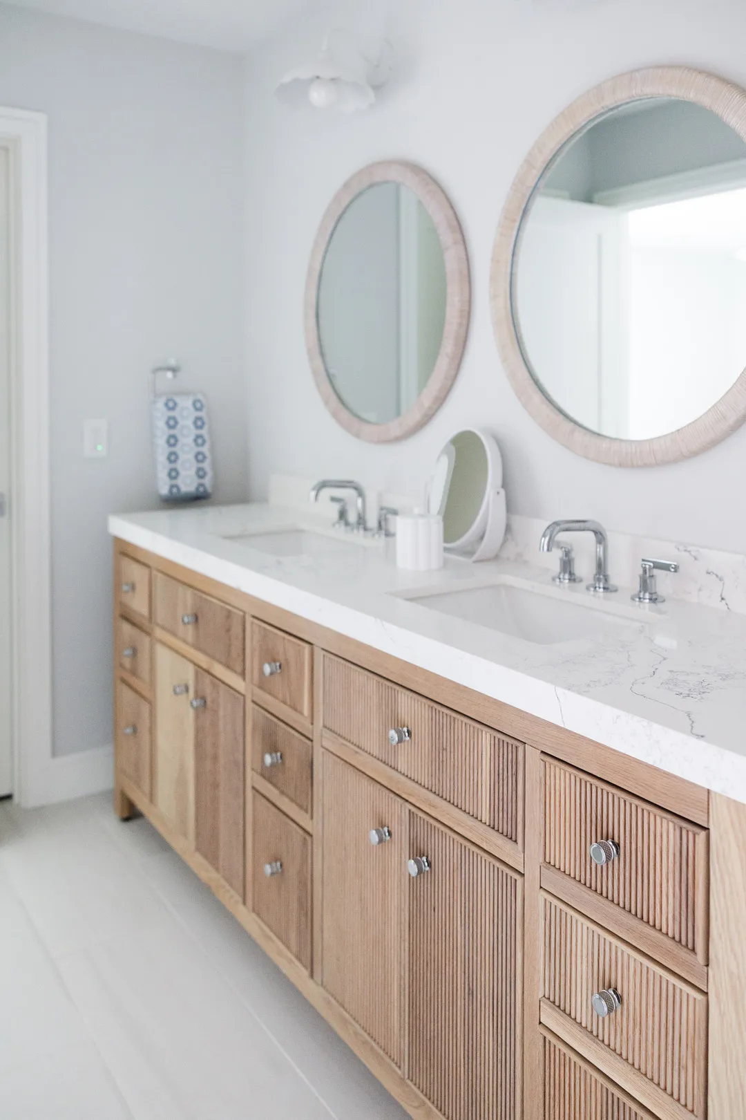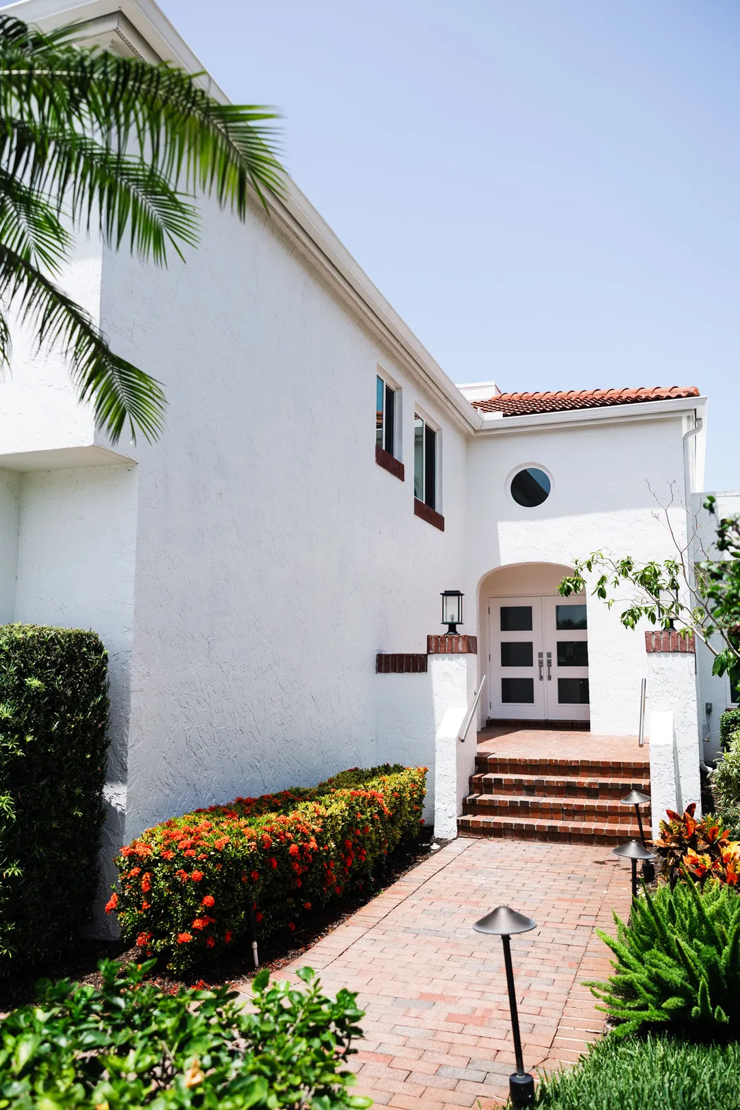 Situated in the exquisite setting of Jonathan's Landing, this 3,275-square-foot golf-front residence has been expertly renovated by Rothrock Construction. Offering three elegant bedrooms and four luxurious baths, the home features stunning interior designs by Rothrock Interiors. The living space is flooded with natural light and showcases high ceilings and a white plaster floral chandelier, enhancing the airy ambiance. The soft coastal style of the home creates a distinct presence in the Palm Beach area. The cool blues and white tones, combined with natural textures, reflect theĀ elements of Juno Beach in this golf community residence.
