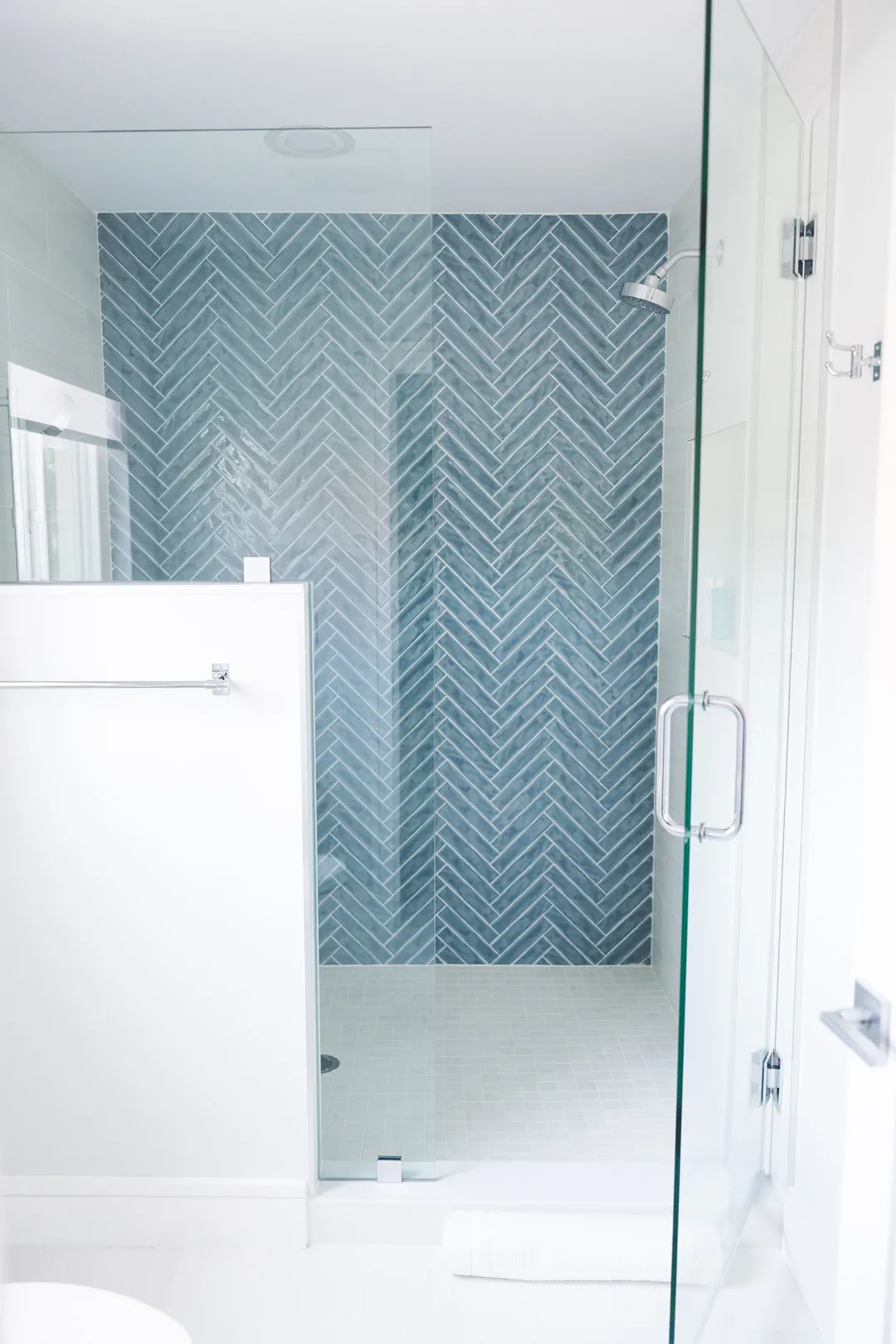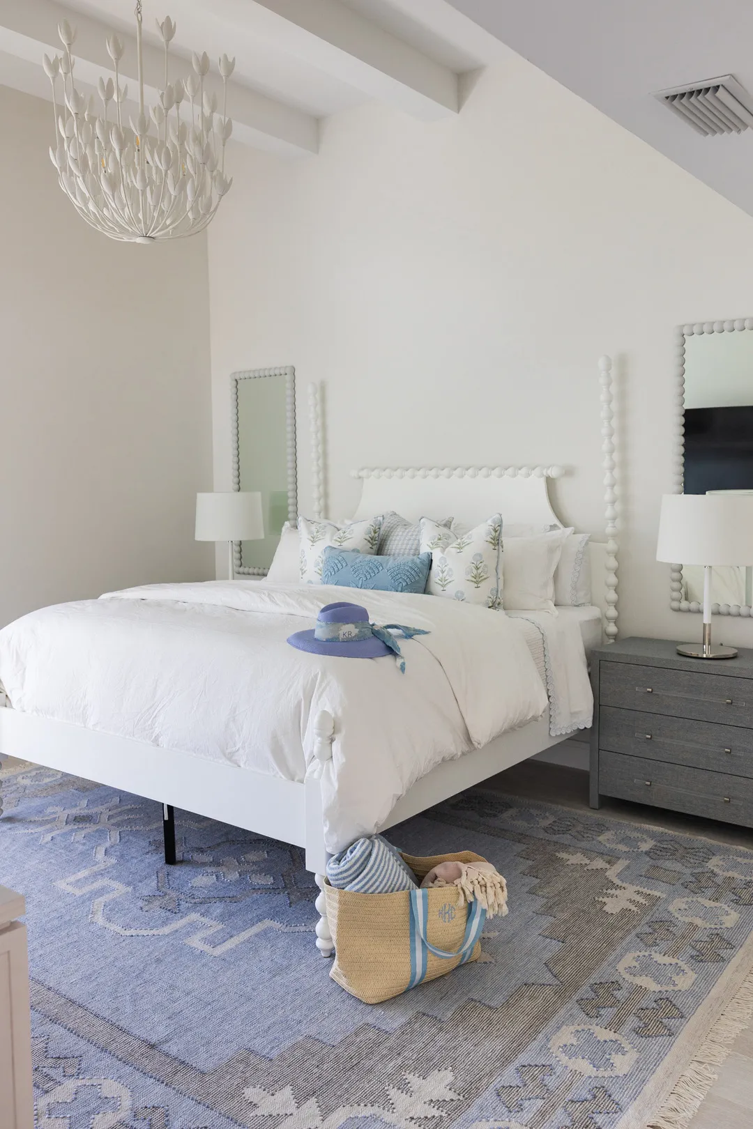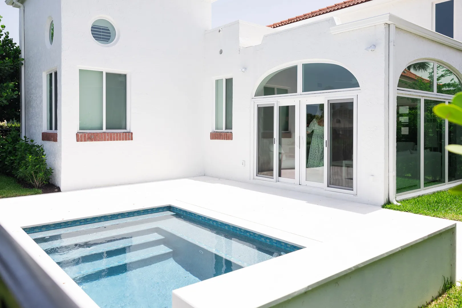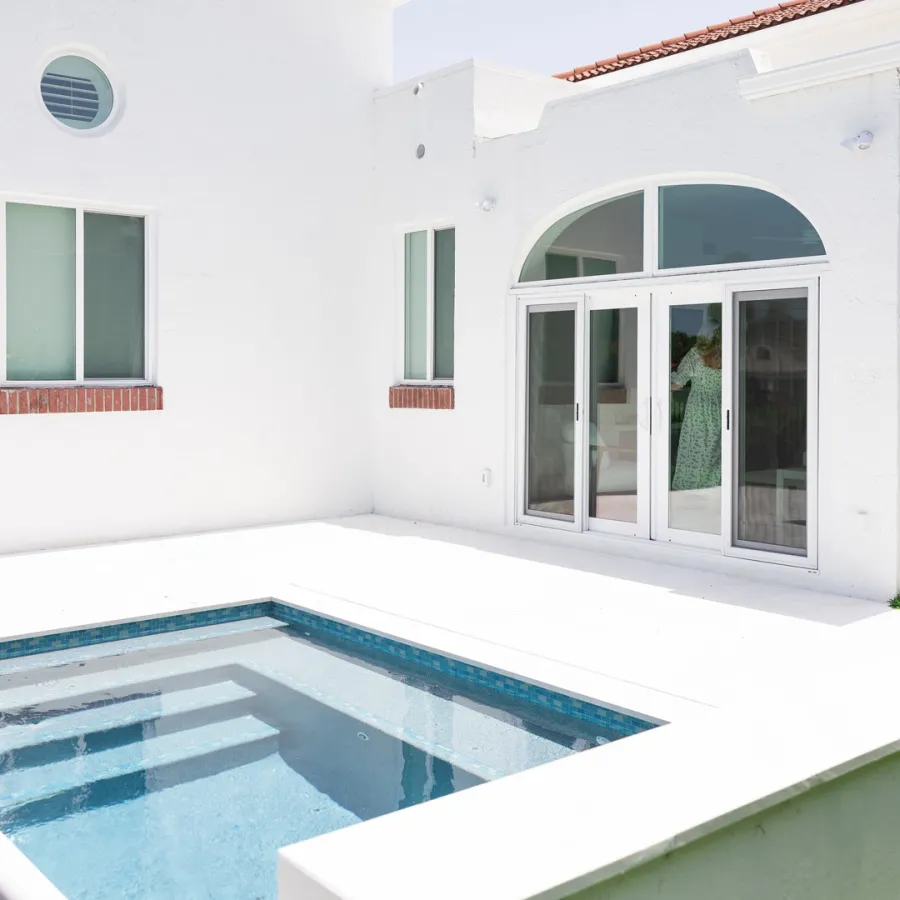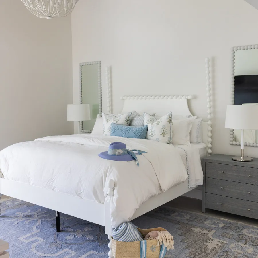 Double doors were added to the master bedroom, creating a grand entrance to a room filled with natural light that looks out over the new pool. The light-filtering shades and white beams along the ceiling contribute to making this master bedroom an oasis.